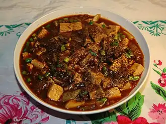 Mápó dòufu (麻婆豆腐), also romanized as mapo tofu, is a classic spicy tofu and meat dish from the Szechuan province of China. It is a very flavourful, easy-to-prepare, and spicy dish.
