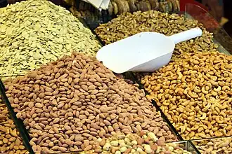 Nuts in cuisine are a much less restrictive category than nuts in botany, the term being applied to many seeds that are not true nuts in the botanical sense. Any large, oily kernel found within a shell and used in food may be regarded as a nut. Because nuts generally have a high oil content, they are a highly prized food and energy source. A large number of seeds are edible by humans and used in cooking, eaten raw, sprouted, or roasted as a snack food, or pressed for oil that is used in cookery and cosmetics.