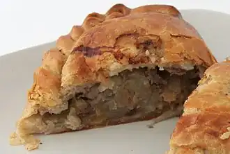 A pasty (Cornish: pasti, hoggan, incorrectly written as pastie) is a type of pie, originally from Cornwall, in the United Kingdom. It is a baked savory pastry case traditionally filled with sliced meat and vegetables. The ingredients are uncooked before being placed in the unbaked pastry case. Pasties with traditional ingredients are specifically called Cornish pasties. Traditionally, pasties have a semicircular shape, achieved by folding a circular pastry sheet over the filling. The circular edge is then crimped to form a seal.