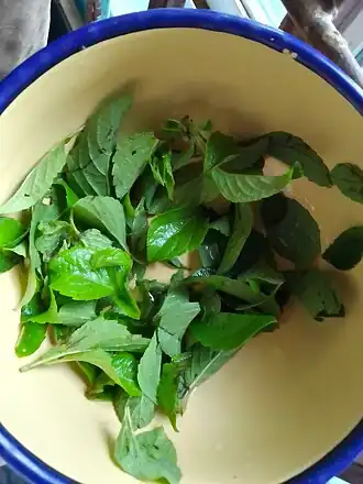 Scent leaf is the leaf of Ocimum gratissimum, a plant native to Africa and South Asia. It goes by many names, including but not limited to efirin, ntong, nchuanwu, dogosui, daidoya, ebe-amwonkho, and mujaaja. It is frequently used as an herb in West African cooking.