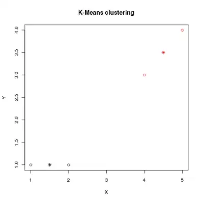 The first way is to plot the object, creating a chart that represents the data. Thus, if there are N objects divided into K clusters, the chart must contain N points representing the objects, and those points must be colored in K different colors, each one representing a cluster set. For example, given the object km, which is a result of the function kmeans application, all one has to do in order to plot the object is: