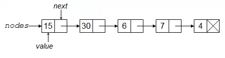 Note that when we iterate the numbers in the chain, we are actually looking at them in reverse order. For example, assume the numbers input to our program are 4, 7, 6, 30, and 15. After EOF is reached, the nodes chain will look like this: