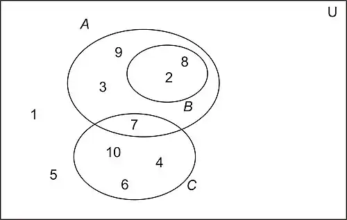 - Other sets are represented by loops, usually oval or circular in shape, drawn inside the rectangle. Again, points inside a given loop represent elements in the set it represents; points outside represent things not in the set.