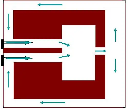 Figure 6: Micro pump utilizing acoustic streaming based on one developed by Rife et al. [7]. The BAW piezo actuators are in black and the arrows indicate the direction of flow.