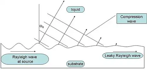 Figure 8: Conversion of SAW, in a solid substrate in contact with a liquid, to planar acoustic pressure waves [6].