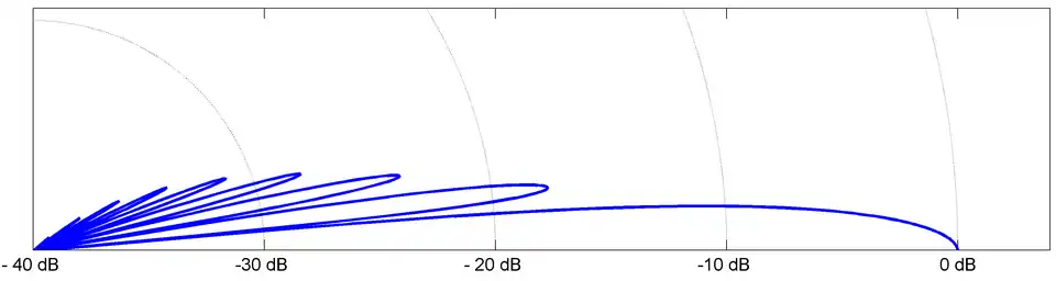 To illustrate the phenomena of side lobes in ultrasound beams, the resulting directivity function and acoustic intensity is calculated for a 1 MHz beam transmitted into water using a 1 cm radius transducer. Figure 2 plots the Directivity function, while Figure 3 plots the acoustic intensity relative to the intensity at the transducer surface.