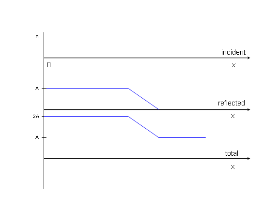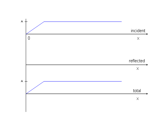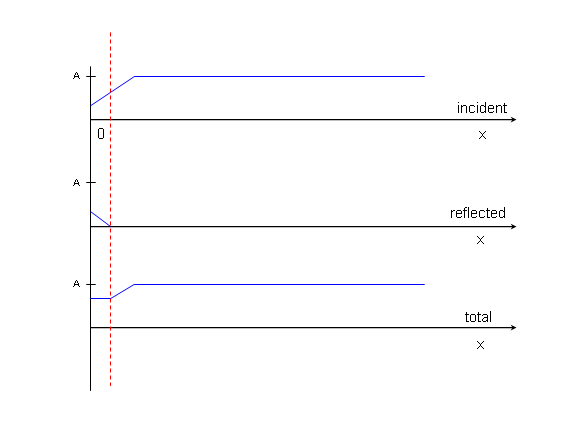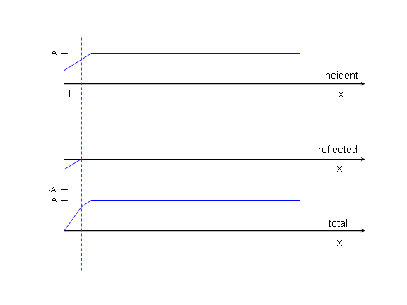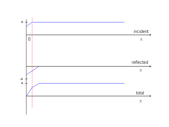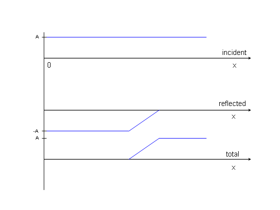 The sequence of wave reflection for incident, reflected and combined waves are illustrated below. Please note that the wave is traveling to the left (negative x direction) at the beginning. The reflected wave is ,of course, traveling to the right (positive x direction).