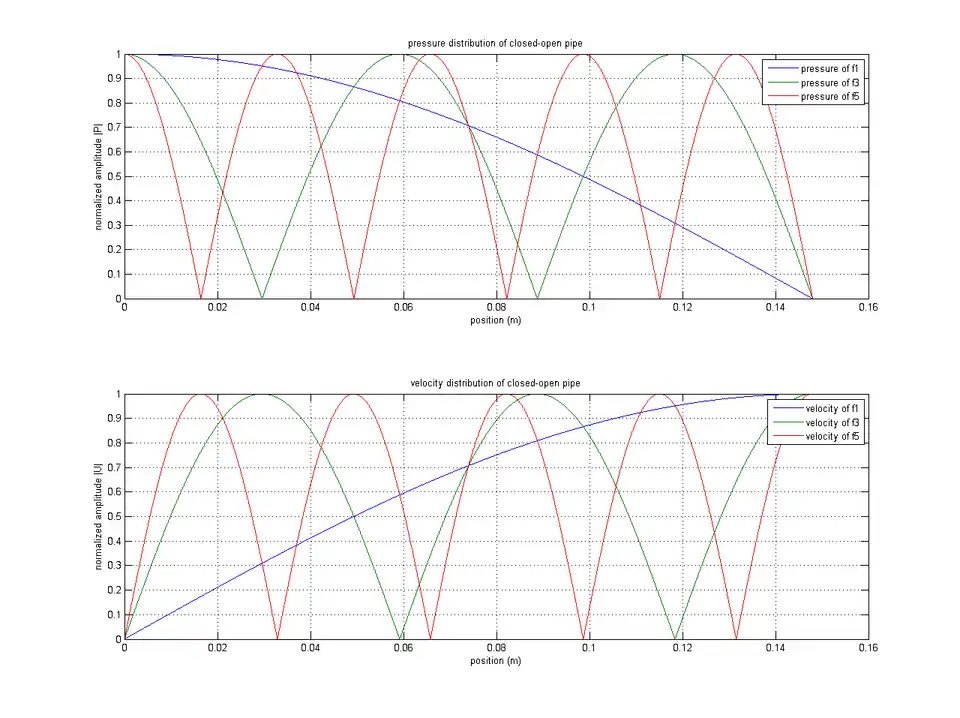 Figure 5 is the normalized pressure and velocity distribution of the 1st, 3rd and 5th resonance frequency of a closed-open pipe of length 148 cm. To simplify the question, the reflectance of the open end is simplified to -1 and the viscous losses are not accounted.