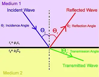 For fluids only, the sound reflection coefficient is defined in terms of the incidence angle and the characteristic impedance of the two media as [3]: