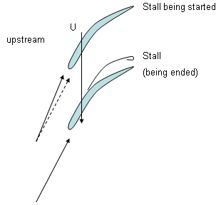 The noise due to stall is a complex phenomenon that occurs at low flow rates. For some reason, if flow is locally disturbed, it can cause stall on one of the blades. As a result, the upstream passage on this blade is partially blocked. Therefore, the mean flow is diverted away from this passage. This causes increasing of the angle of attack on the closest blade at the upstream side of the originally stalled blade, the flow is again stalled there. On the other hand, the other side of the first blade is un-stalled because of reduction of flow angle.