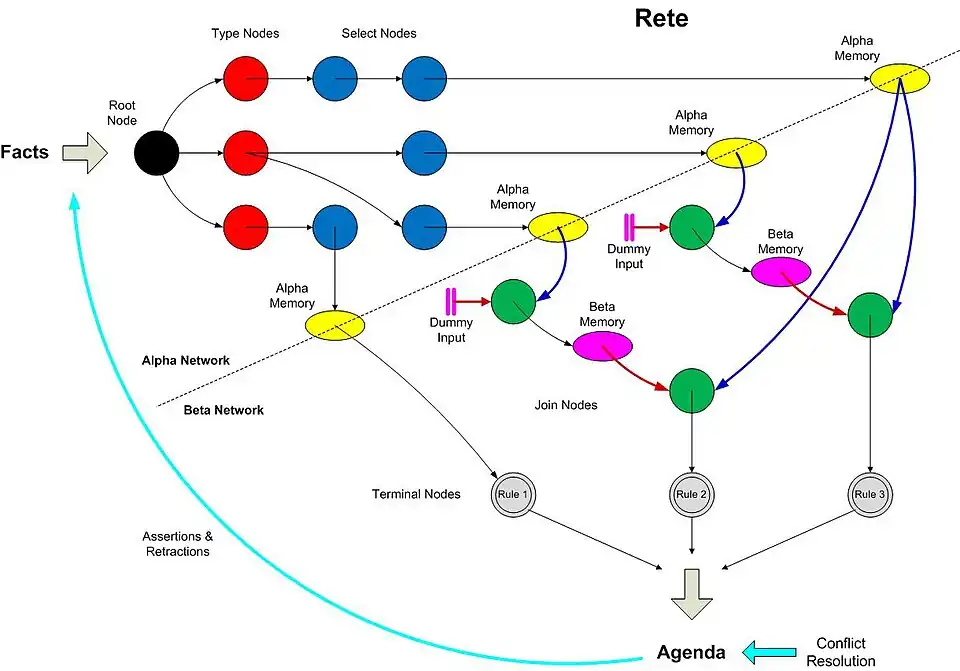 The Rete algorithm provides a generalized logical description of an implementation of functionality responsible for matching data tuples (‘facts’) against productions (‘rules’) in a pattern-matching production system (a category of rule engine). A production consists of one or more conditions and a set of actions which may be undertaken for each complete set of facts that match the conditions. Conditions test fact attributes, including fact type specifiers/identifiers. The Rete algorithm exhibits the following major characteristics:
