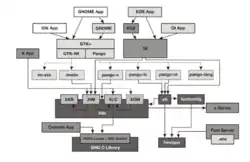 - Toolkits help developers create a consistent look-and-feel among a set of programs. But to make a complete desktop, applications need to interoperate more closely to form a convenient workplace. The concept of desktop environment has been invented to provide common conventions, resource sharing and communication among applications. The first desktop environment ever created on UNIX platforms was CDE (Common Desktop Environment) by Open Group, based on its Motif toolkit. But it is proprietary. The first FOSS desktop environment for GNU/Linux is KDE (K Desktop Environment),[4] based on TrollTech’s Qt toolkit. However, due to some licensing conditions of Qt at that time, some developers didn’t like it. A second one was thus created, called GNOME (GNU Network Object Modelling Environment),[5] based on GTK+. Nowadays, although the licensing issue of Qt has been resolved, GNOME continues to grow and get more support from vendors and the community. KDE and GNOME have thus become the desktops most widely used on GNU/Linux and other FOSS operating systems such as FreeBSD.