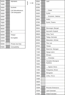 Basic Multilingual Plane (BMP), or Plane 0, is most commonly in general documents. Code points are allocated for common characters in contemporary scripts with exactly the same set as ISO/IEC 10646-1, as summarized in Figure 2 in section ý0 Note that the code points between E000 and F900 are reserved for the vendors' private use. No character is assigned in this area.