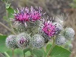 ![]() Arctium is an Old World genus whose biennial plants have been introduced around the world, perhaps in part due to Velcro-like burrs that promote wide seed dispersal. |