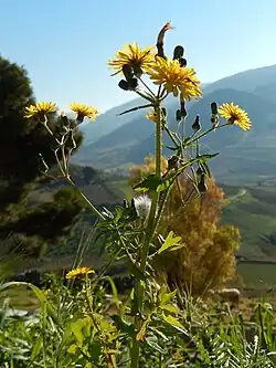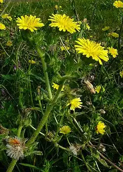 | The members of the Cichorieae have white latex and most have flower heads with perfect 5-dentate, mostly-yellow, ligulate flowers.[1]