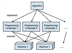 Programming languages (high level or machine level) are tools for expressing algorithms to machines. When we create algorithms to solve problems conceptually we want to create them independent of the languages. A well-designed recipe ought to work for different cooks in different kitchens. So the steps or units of work must be defined in terms of a higher abstraction - a set of common data structure, operations and control structures that all languages support. By creating algorithms conceptually using abstractions allows us humans to think on a higher level closer to the problem domain we know. When an algorithm is implemented in a particular language the abstract steps can be mapped to the specific expression in the language. We are confident the chain of tools we have can translate the solution to the machine level executable code. The following diagram shows that the same algorithm can be implemented in a variety of programming languages and the result programs can be executed on different machine models (maybe after some translation).