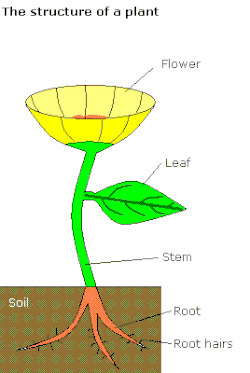 Plants are divided into flowers, stems, leaves and roots with root hairs. A generalised plant is shown in the illustration.