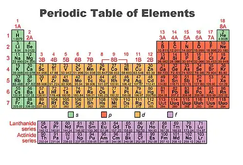 The Periodic Table does more than just list the elements. The word periodic means that in each row, or period, there is a pattern of characteristics in the elements. This is because the elements are listed in part by their electron configuration. The Alkali metals and Alkaline earth metals have one and two valence electrons (electrons in the outer shell) respectively. These elements lose electrons to form bonds easily, and are thus very reactive. These elements are the s-block of the periodic table. The p-block, on the right, contains common non-metals such as chlorine and helium. The noble gases, in the column on the right, almost never react, since they have eight valence electrons, which makes it very stable. The halogens, directly to the left of the noble gases, readily gain electrons and react with metals. The s and p blocks make up the main-group elements, also known as representative elements. The d-block, which is the largest, consists of transition metals such as copper, iron, and gold. The f-block, on the bottom, contains rarer metals including uranium. Elements in the same Group or Family have the same configuration of valence electrons, making them behave in chemically similar ways.