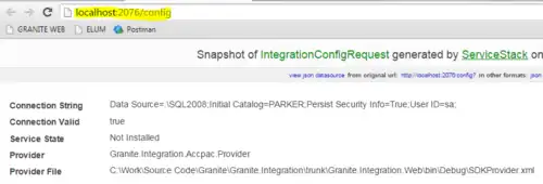 - Opening the http://localhost:2076/config page will run through various tests and return the integration configuration.