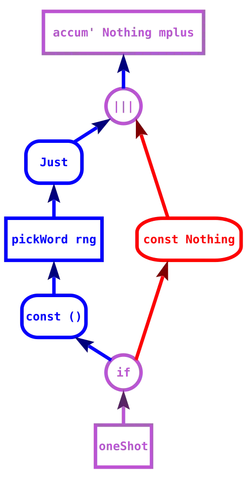 getWord example of the tutorial. Blue indicates a Left tag and red indicates Right. Note that the if construct of proc notation sends True to Left and False to Right. Corresponding code:proc () -> do