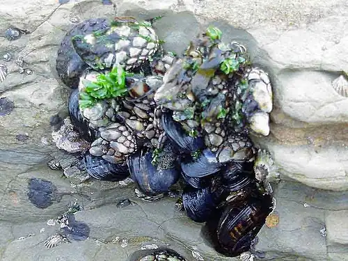 A great abundance of life can be found in the intertidal zone. Many intertidal animals can live in or out of the water; some spend one part of their lives in the water and another out of the water. They must be adapted to frequent shifting of water levels and wave impacts. In response, many have hard shells and strong attachments that keep them safe. Some animals, like marine mussels, cling steadily to a rock for their entire lives (Figure 14.34). Many young organisms get their start in estuaries, which are special ecosystems affected by the tides, where freshwater and salt water come together.