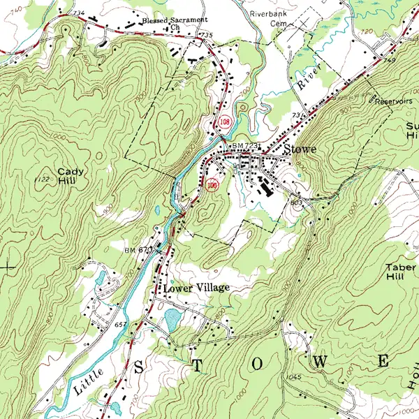 Figure 2.30: Portion of a USGS topographic map of Stowe, VT. In this map, you can see Cady Hill (elevation 1122 ft) indicated by concentric circles in the lower left portion of the map and another hill (elevation ˜ 960 ft) in the upper right portion of the map. - Hatched concentric circles indicate a depression. The hatch marks are short, perpendicular lines inside the circle. The innermost hatched circle would represent the deepest part of the depression, while the outer hatched circles represent higher elevations.