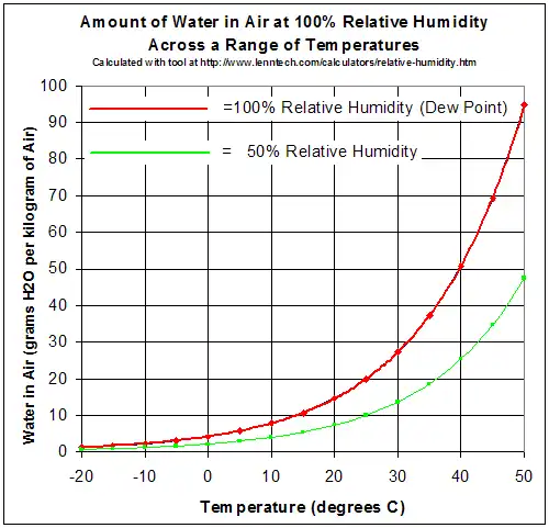 Since warm air can hold more water vapor than cool air, raising or lowering temperature can change air's relative humidity (Figure 16.1). The temperature at which air becomes saturated with water is called the air's dew point. This term makes sense, because water will condense from the air as dew, if the air cools down overnight and reaches 100% humidity.