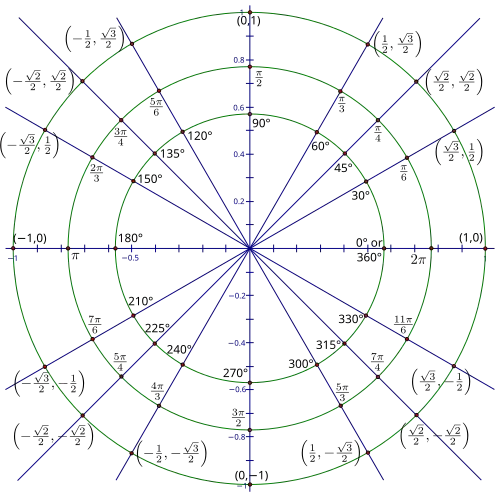 - This diagram shows a unit circle with all the angles that have reference angles of 30°, 45°, and 60°, as well as the quadrant angles. Label the coordinates of all points on the unit circle. On the smallest circle, label the angles in degrees, and on the middle circle, label the angles in radians.