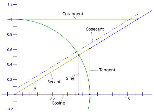 - Draw and label the line segments in the following drawing that represent the six trigonometric functions (sine, cosine, tangent, cosecant, secant, cotangent).