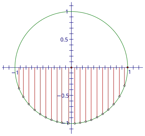 Notice that once we rotate around once, the point traces back over the same values again. The red curve that you see is one period of a sine "wave". The below animation shows this happen in "real time".