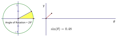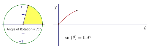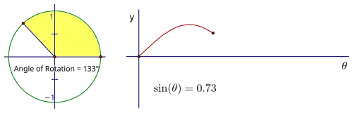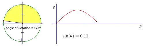 Let's translate this circular motion into a graph of the sine value vs. the angle of rotation. The following sequence of pictures demonstrates the connection. As the angle of rotation increases, watch the y-coordinate of the point on the angle as it traces horizontally. Ignore the values along the horizontal axis at this point as they just relative. What is important is that you make the connection between the circular rotation and the change in the height of the point.