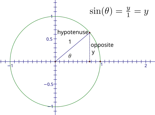 The denominator is now 1, so we have the simpler expression sin(θ) = y. The advantage to this is that we can use the y-coordinate of the point on the unit circle to trace the value of sin(θ) through a complete rotation. Imagine if we start at 0 and then rotate counter-clockwise through gradually increasing angles. Since the y-coordinate is the sine value, watch the height of the point as you rotate.
