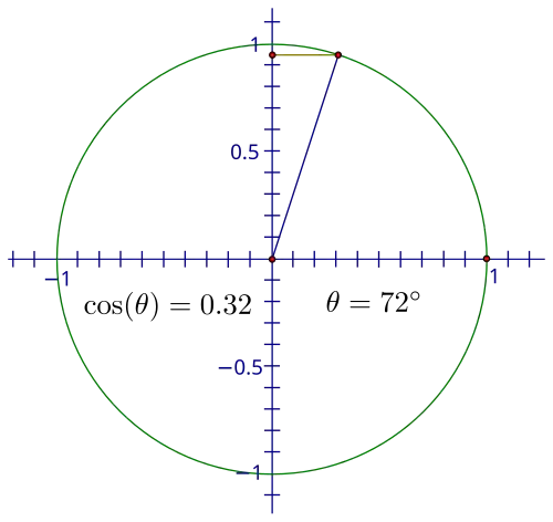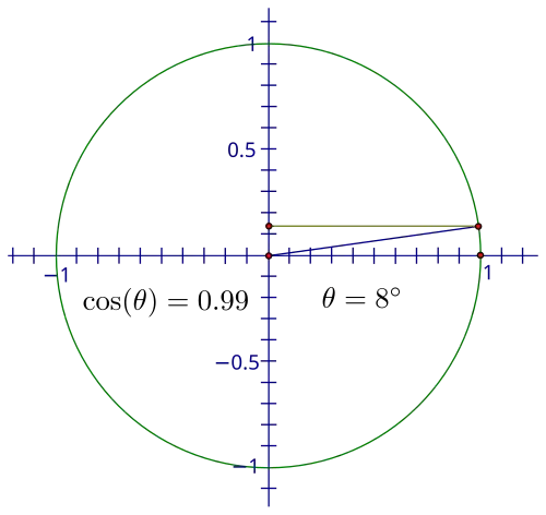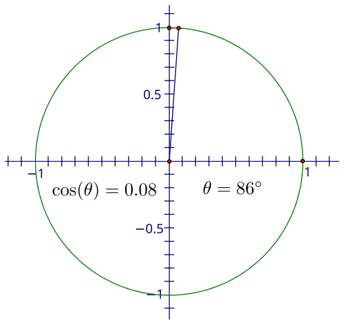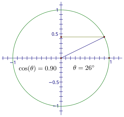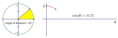 The cosine of an angle is the ratio of , so in the unit circle, the cosine is the x-coordinate of the point of rotation. If we trace the x−coordinate through a rotation, you will notice the change in the distance is similar to sin(x), but cos(x) starts in a different place. The x−coordinate of a 0° angle is 1 and the x-coordinate for 90° is 0, so the cosine value is decreasing from 1 to 0 through the 1st quadrant.