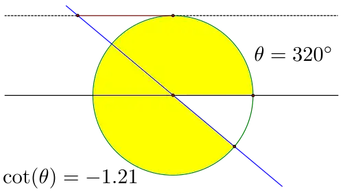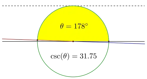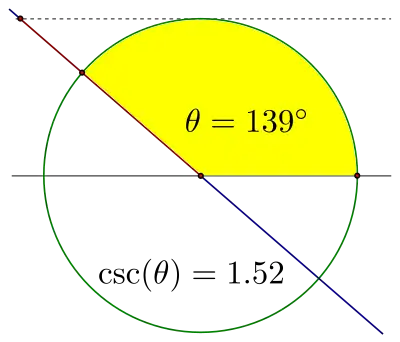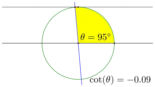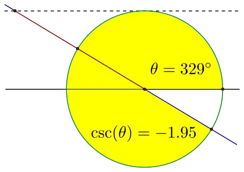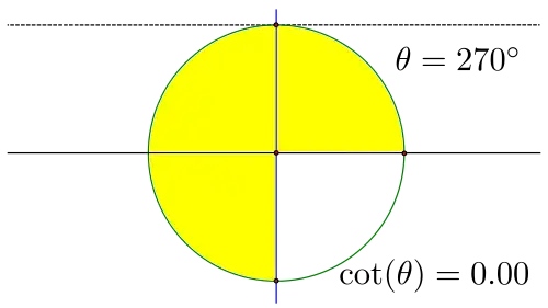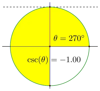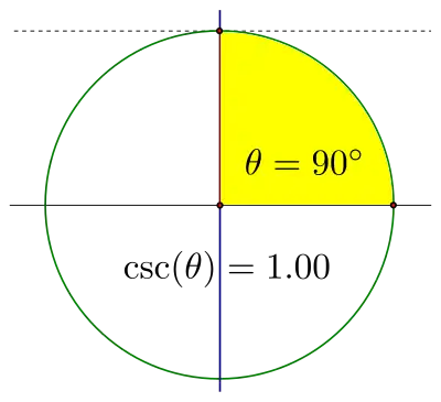 Tracing the length of this segment, it is undefined at 0°, infinitely large for very small angles, decreasing to 1 at 90° and then increasing infinitely until it is undefined at 180°. The process repeats from 180° to 360°, however, the segment starts infinitely negative, increases to −1 at 270° before approaching an infinitely negative length.