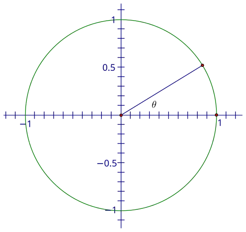 The six trigonometric functions defined by the ratios in a right triangle can be placed in the context of the coordinate grid by thinking of them in terms of a point (x, y) rotating around a circle centered at the origin with a radius of one. This circle is called the unit circle. The sine of the angle of rotation is the y−coordinate of the point, the cosine of the angle is the x coordinate, and the tangent is . The values of the other three ratios; cotangent, cosecant, and secant can also be found in terms of their reciprocal relationships, but all of these values can be constructed geometrically as various segments around the angle of rotation on the unit circle. Instead of finding isolated values, we can look at each ratio as a function of the angle of rotation. These are called circular functions. Here are the domains and ranges of the six circular trigonometric functions.