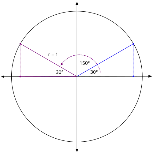 In the previous lesson, one of the review questions asked you to consider the angle 150°. If we graph this angle in standard position, we see that the terminal side of this angle is a reflection of the terminal side of 30°, across the y−axis.