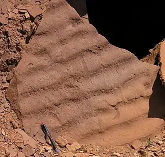 - Wave ripples. These are superficially similar to the ripples produced in desert sand, but they tend to be more symmetrical in cross-section, because they are formed by waves going in both directions (oscillatory flow).