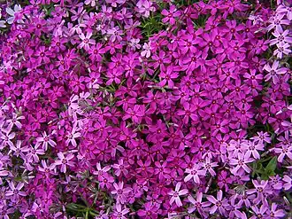 Phlox subulata [1] (Moss Phlox, Moss Pink, Mountain Phlox) is a perennial creeper growing to a height of 6 inches and covering a 20 inch wide area. The small, five-petaled flowers bloom in rose, mauve, blue, white, or pink in late spring to early summer.