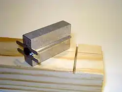 Insert a single axle (without the wheel) in the car body. Do not use a hammer, instead place the axle partially into the hole and gently press it into the body. Grasp the car body firmly and press the axle head against a flat surface and insert the axle until about 7/16" is protruding. The surface should not be hard or slippery; a wooden workbench is ideal. If you are using axle slots, an axle insertion tool can be useful.[1]