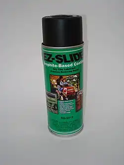 Alkyd based graphite spray paint in naptha and mineral spirits carrier (MSDS) can be used to paint axles and portions of the car body with a thin graphite coating. Care should be taken with this spray since the naptha may dissolve plastic and paint. When the carrier solvent evaporates, the alkyd resin hardens and holds the graphite in place. Graphite coating is used on lawn mowers and farm equipment to keep cuttings and other material from sticking.