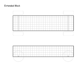 The first step in designing your car is picking the wheelbase. If the rules of your race do not specify that the original wheelbase or axle slots must be used, it is often possible to improve car performance using the longest wheelbase. WIth a long wheelbase, the weight can be moved further to the back while still remaining forward of the rear axle and errors in wheel alignment will affect the long wheelbase car less since it has a larger turning radius for a given angular wheel deflection. The standard pinewood derby wheelbase is about 4.5 inches. The extended wheelbase is 5.75 inches with the wheels 5/8 inch from the end of the 7 inch block.[2] Even when the standard wheelbase is required by the rules, it may be possible to move the rear axle back by cutting off the back of the block, leaving 5/8 inch between the axle slot and the back of the block, and gluing the removed piece to the front of the car.