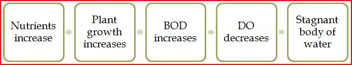 Nitrates from fertilizers and phosphates from detergents can accumulate in lakes and streams. These nutrients can increase the growth of plants and algae. This impacts the BOD because if plant growth increases too fast and the dissolved oxygen (DO) is not sufficient to decompose all organic material and waste by aerobic decomposition, anaerobic decomposition will occur. More species will die as a result of the anaerobic decay. The lake will become stagnant and devoid of life.