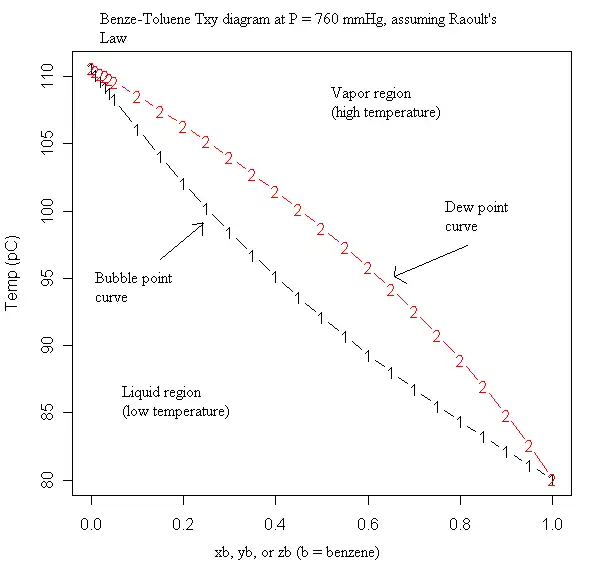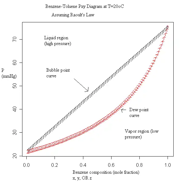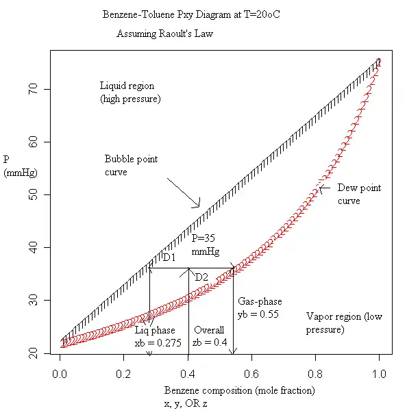 The net result is, like flashing, more of the lower-boiling compound(s) will exit at the top of the column, and more of the higher-boiling compound(s) will fall to the bottoms. Since distillation is multiple flashes in a row, it is typically more effective than a single flash, although the latter may be sufficient depending on the purpose. Distillation columns are standard for many types of separations because it is relatively inexpensive for its efficacy. Distillation has a limit, however: non-ideal mixtures can form azeotropes. An azeotrope is a point at which when the solution boils, the vapor has the same composition as the liquid. Therefore no further separation can be done without another method or without using some special tricks.