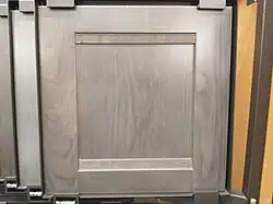 The traditional type of a cabinet front element in the United States is the panel door (see image: C), made out of four solid wood frame pieces which enclose a (thinner) panel. Slab doors are made out of one solid piece of wood or engineered wood (A) and commonly associated with a more modern appearance. Some doors, for example plank style doors, fit into neither of those categories.