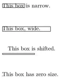 Makebox creates a single-line box, optionally of fixed width, but otherwise large enough to hold its contents. Note that the width does not have to be wider than the contents: for instance, setting width to 0 typesets the content without changing the current position. (E.g., this would allow for an overstrike.) Makebox is typically used to prevent hyphenation (see Hyphenation) or simply to keep text that belongs together from being placed on separate lines. You cannot place line breaks (\\) within a Makebox. mbox is the shorthand no-option version of Makebox.