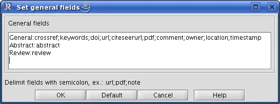 Second, we add the BibTeX field location for information about the location, where the publication is available as hard copy (e.g. a book or a copy of an article). This field can contain the name of the user who has the hard copy and where he has it or the name of a library and the shelf-mark. This field can be added in JabRef by selecting Options → Set up general fields and adding the word location (using the semicolon (;) as delimiter) somewhere in the line that starts with General: (see figure 4).