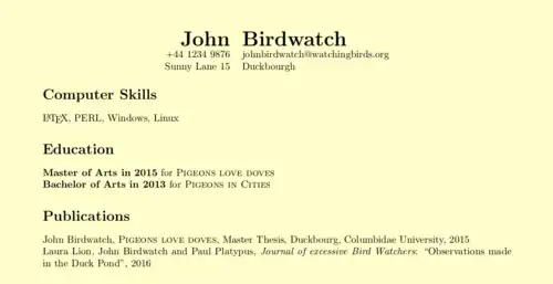 The example above has a simple centered header including name and personal information. The publications section is done completely by hand. If you have many publications, you should consider using a bibliography management package, see Biblatex. Another small example that uses package biblatex.
