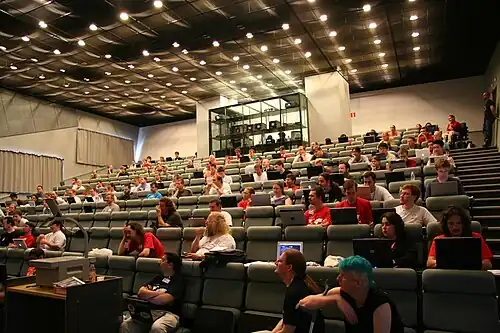 Crowdsourcing is being used directly in classrooms to engage students, increase student participation, get student feedback, create course content, and even determine grades. A popular example is the clicker, an audience response tool designed to get quick feedback from students and encourage classroom learning through “peer instruction”.[6] One such product on the market is promoted to have been "adopted by more than 1000 higher educational institutions in North America and used by over 2 million students".[7] Microblogging services like Twitter are also being used in classrooms to increase student participation. Professor Rankin at the University of Texas at Dallas taught her history class through classroom discussion on Twitter once a week,[8] and a professor at the Pennsylvania State University encouraged students to pass notes in class using Twitter.[9] Colleges are also investing in commercial learning management systems that facilitate crowdsourcing in classrooms through online collaboration tools. As a supplement to these systems, the Social Media Classroom provides additional social media functionality for learning in the classroom.[10] Teachers are also crowdsourcing the teaching and grading process to students. Most notably, Professor Cathy Davison of Duke University enabled students in her “This is Your Brain on the Internet” class to take turns to design their own curriculum and grade one another’s assignments.[11] Another example is Coursera, an online education portal offering online courses. Coursera trains its students to grade assessments and combines multiple crowdsourced assessments to obtain a "highly accurate score".[12]