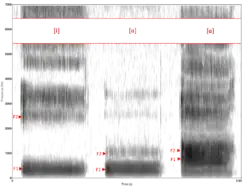 Another way to view formants is by using a spectrogram. This plots time against frequency, with amplitude represented by darkness. Formants show up as dark bands, and their movement may be tracked through time.