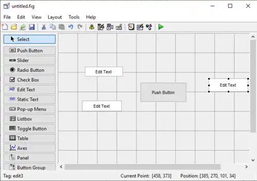 We will create example of a simple GUI created with the GUIDE toolbox It takes inputs of two numbers and adds them and displays them in the third textbox It is very simple but it helps illustrate the fact that such a GUI was created in minutes.